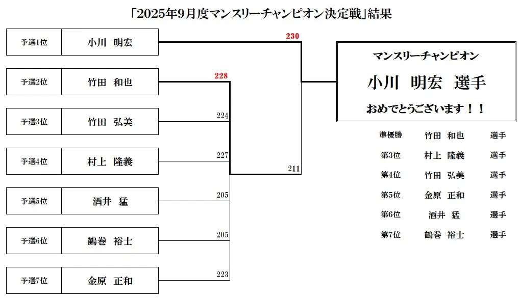 | 25 | 川合隆治 選手 | 171 | 190 | 171 | 246 | 778 | 798 |
