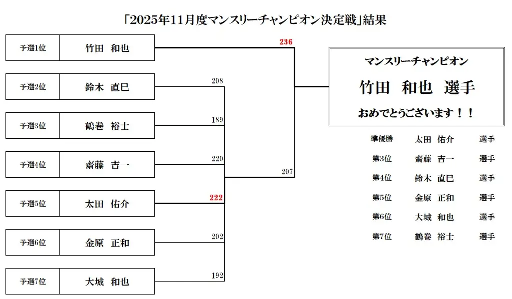 2025年10月26日(日)9:30より行われたボウリング大会「2025年10月度マンスリーチャンピオン決定戦」ボウリング大会の結果をお知らせ致します。